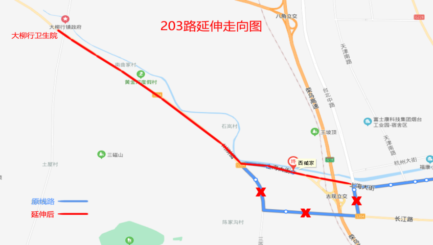 沿三亚路与省道S304增设小臧家村、三亚路、万华磁山全球开发设计中心、马格庄、山东黄金、南曲家村、小柳行村、石家、大柳行交通管理所、大柳行卫生院等10处站点。