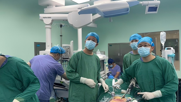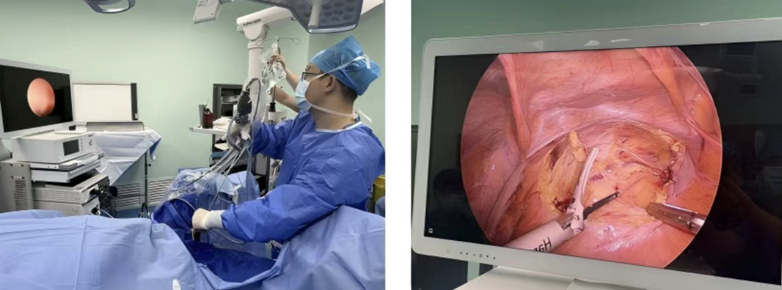 盆腔肿瘤与输尿管等重要脏器粘连,泌尿外科医学中心团队术中巧妙植入输尿管支架,就像给地下管线贴上了“荧光标识”,防止术中损伤。同时,运用腹腔镜的“微创视角”小心分离,有效保障后续肿瘤的完整切除工作。