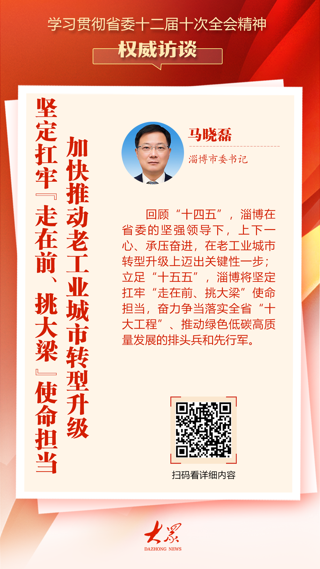 立足“十五五”,淄博将坚定扛牢“走在前、挑大梁”使命担当,奋力争当落实全省“十大工程”、推动绿色低碳高质量发展的排头兵和先行军,聚焦做强发展“硬支撑”,实施传统产业培优和新兴产业壮大行动,做实“人工智能+”、中小企业数字化转型等支撑,打造现代制造业、科技创新、数字转型新高地;聚焦做优发展“软环境”,推深做实“五个淄博”建设,以更高层次文明创建引领高质量发展,为新时代社会主义现代化强省建设作出更多淄博贡献。