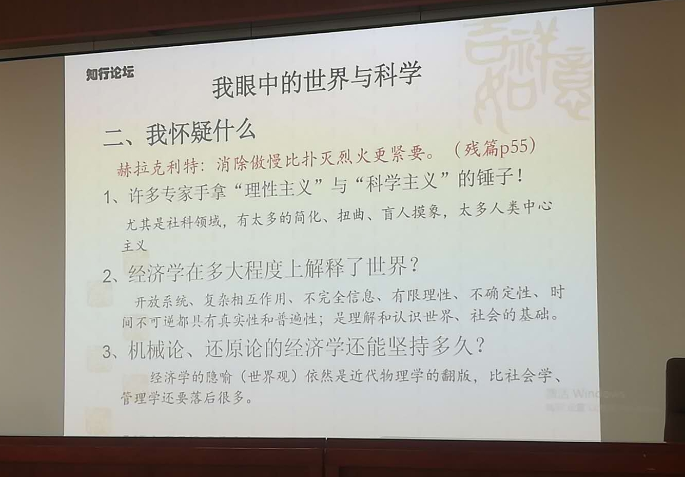 杨风禄教授作了题为关于“复杂世界中的理性与科学”的报告,介绍了他眼中的世界与科学,他相信概率论统治世界,指出风物长宜放眼量,科学的“启示”、榜样的力量、对现代科学状况(尤其是经济学状况)的不满、学以致用的初心、“山大服务山东的号召”以及经济学院学科建设的需要等原因决定了山东大学知行研究中心的成立。作为山东大学知行研究中心的主任,他指出知行研究中心的目标和方向是复杂世界的经济和社会研究、典史研究(问道大师)、企业经略与经济和社会政策研究。研究中心是一个跨学科的交流和研究平台,有知行合一的行动目标、开放的研究团队、合作共赢的组织原则。