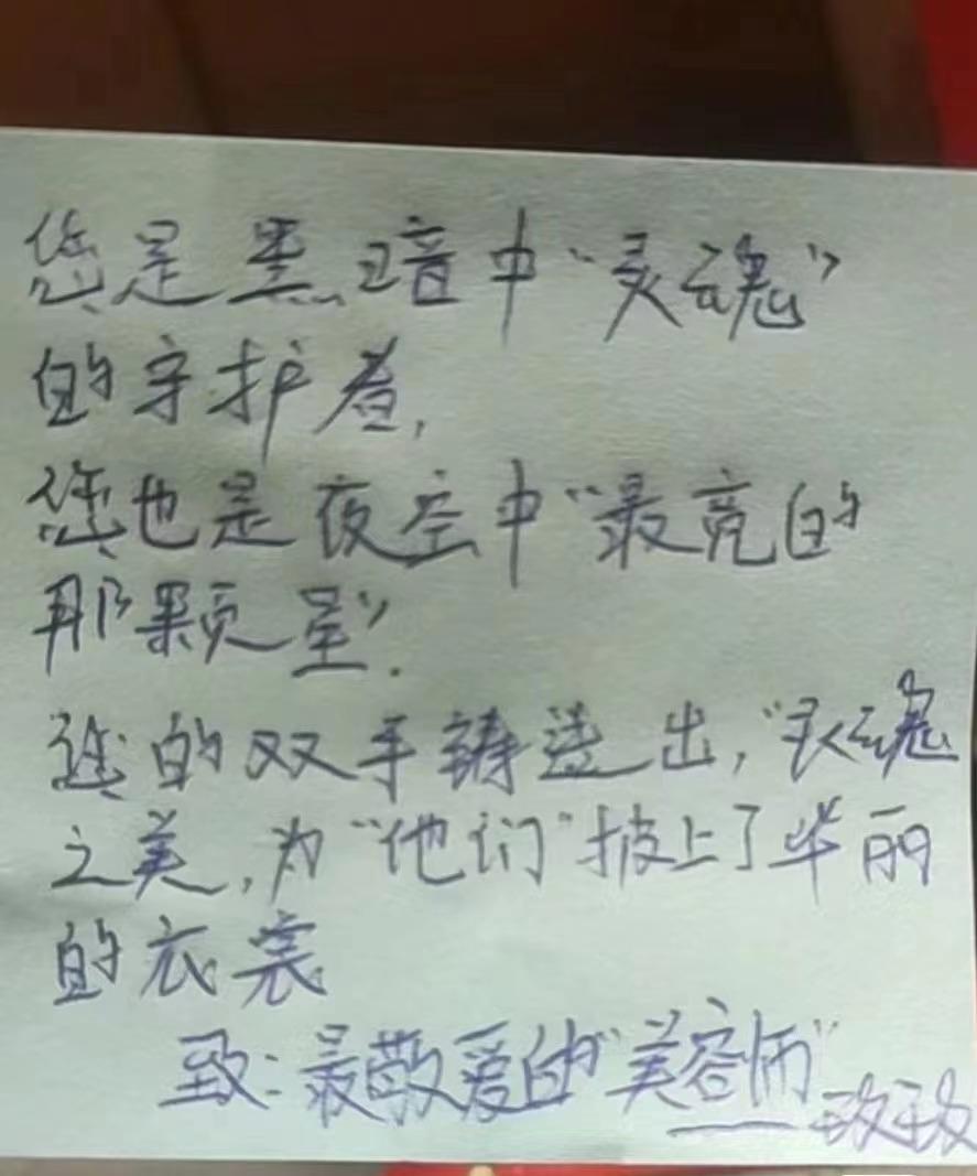 大众对殡葬行业的接纳度也越来越高。一年前,茶泉灵和一名朋友视频聊天。当时对方正在一家餐厅吃饭,聊天中茶泉灵无意间提及自己的工作,而后她的朋友就收到了服务员递来的纸条,托她转给茶泉灵。纸条上写着:您是黑暗中“灵魂”的守护者,也是夜空中“最亮的那颗星”。您的双手铸造出灵魂之美,为他们披上华丽的衣裳——致最敬爱的“美容师”。