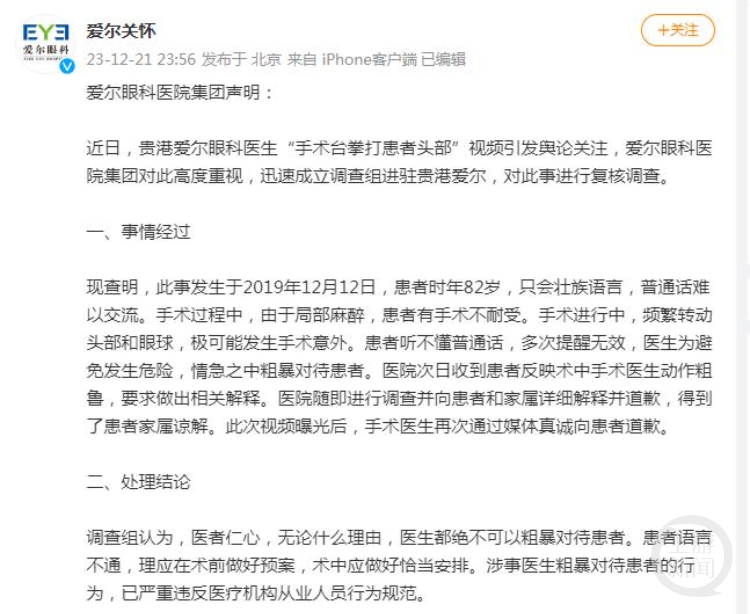 21日夜间,爱尔眼科医院集团在微博发布最新声明,表示涉事医生粗暴对待患者的行为,已严重违反医疗机构从业人员行为规范。集团已于21日下午免去贵港爱尔CEO职务,暂停院长(即手术医生)职务,两人均接受进一步调查。下一步,集团将敦促贵港爱尔深入整改,并将根据后续调查结果做进一步严肃处理。