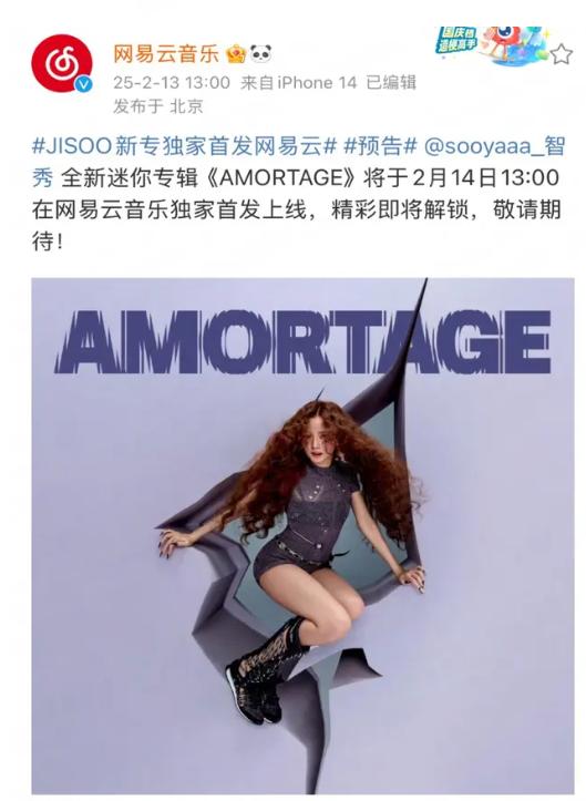 据网易云音乐官方消息,2月14日13:00,韩国著名女歌手JISOO(金智秀)个人迷你专辑《AMORTAGE》将在网易云音乐独家首发上线,乐迷购买数字专辑后可永久畅听。据悉,JISOO是韩国知名女子组合BLACKPINK成员,《AMORTAGE》是她作为独立歌手发行的首张个人迷你专辑。