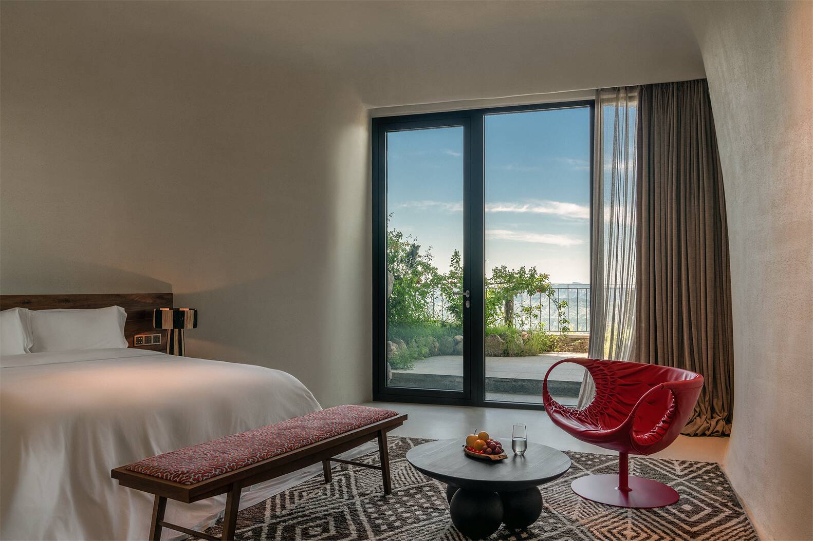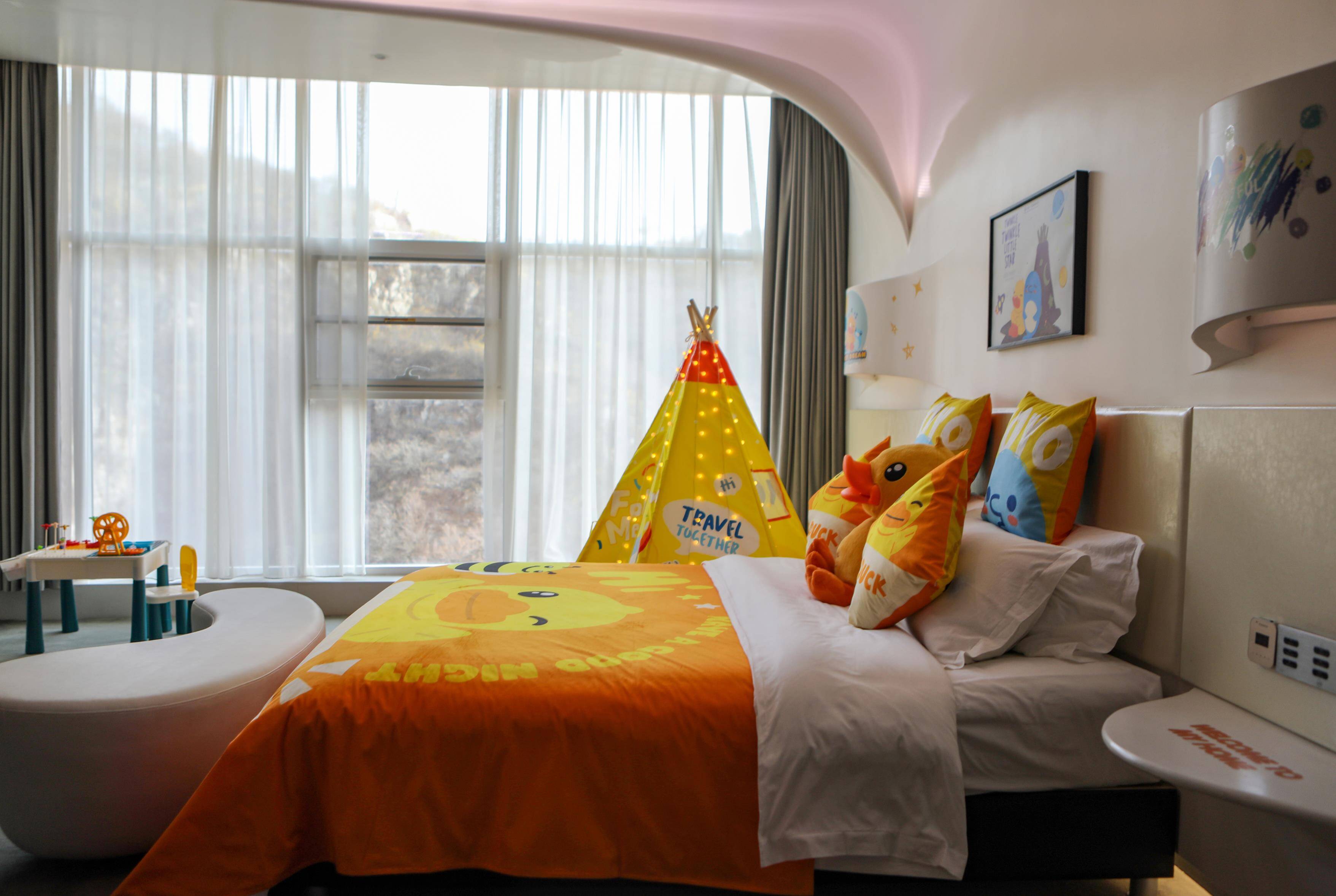 入住毗邻高空玻璃桥的高空酒店,充满童趣的B.Duck小黄鸭主题房点缀亲子度假时光,270°全景落地窗尽览大好河山;