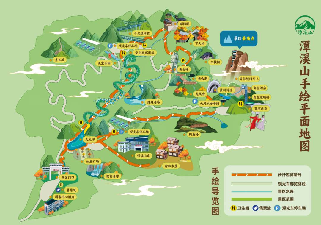 潭溪山现有世界首例无背索斜拉弧形玻璃桥、山东省内最长峡谷漂流、中国首创洞穴式超媒体梦幻乐园星洞传说、千米速滑道、高空威亚五大地标性体验项目,齐长城清川上野奢探险度假营、高空酒店、森林木屋、潭溪山庄、游客中心五大度假酒店,龙凤台、美女峰、昭阳洞等100余处自然人文景观,兼具自然野趣与沉浸式体验。