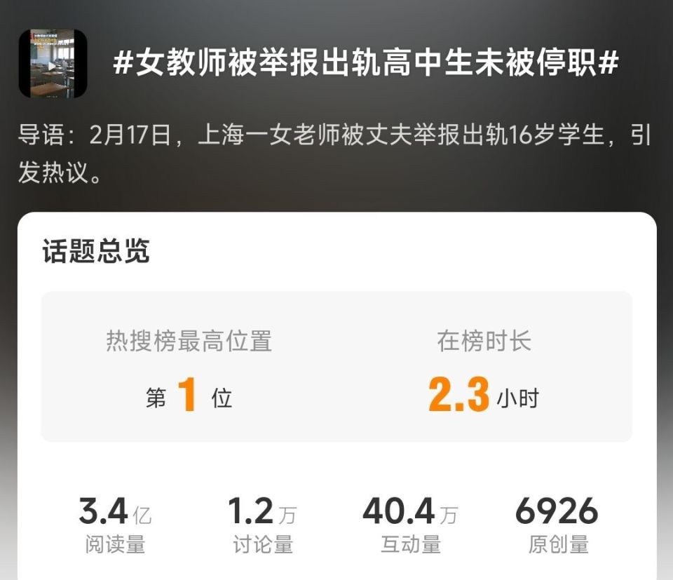 2月19日,上海市徐汇区某中学教师“被丈夫实名举报出轨16岁学生”的事件登上微博热搜。