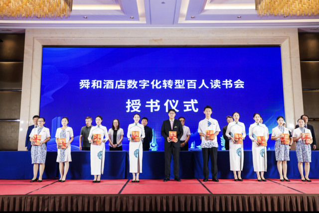 论坛现场,济南酒店总经理俱乐部全体总经理发起一封《推进济南市酒店业数字化转型倡议书》,20名总经理代表登台共同签署倡议书,并向他们赠送由广州问途科技与教育机构创始人黄昕主编的六册“酒店数字化系列书籍”。与此同时,与会领导、嘉宾为“舜和酒店数字化转型百人读书会”代表授书。