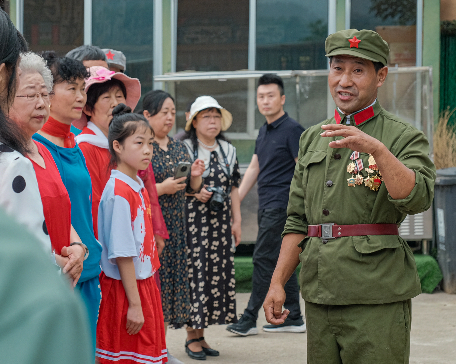 走进老兵之家,大家就被红色教育基地吸引住了。猫耳洞门口摆放着枪支、爆破筒、电台、弹药箱、钢盔等,一副对联仿佛把人们带入那场战争:大洞小洞猫耳洞洞洞藏龙卧虎,手枪机枪冲锋枪枪枪怒火满堂。大家纷纷想和参战退伍老兵王恩亮合影。谁不想和最可爱的人合影留念啊!兵妈妈赶紧招呼大家,演出结束后给大家留出合影的时间。演员赶紧装扮上,演出马上就要开始了。