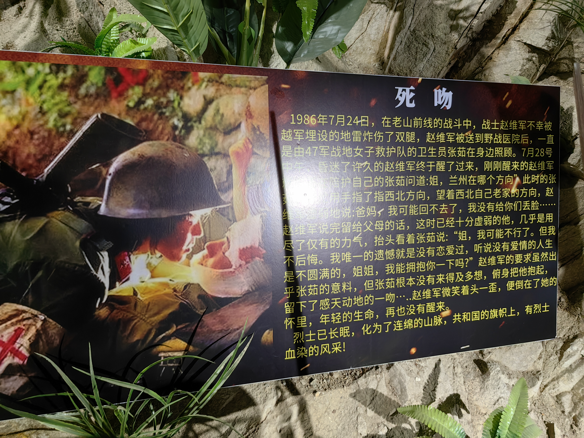 演出结束后,大家开始参观猫耳洞红色教育基地,参战退伍老兵王恩亮为大家一一讲解,一幅幅图片,每一张图片背后都有一个感人的故事,图片“死吻”感动了在场的所有人,战争是多么的可怕,夺走了多少人鲜活的生命,为了祖国的安危,人民的幸福,他们舍小家,顾大家,不顾个人安危,义无反顾奔赴战场,英勇杀敌,保家卫国,壮烈牺牲,大家向烈士默哀并鞠躬致敬。老兵王恩亮为大家讲解了观敌台、老山前线帐篷小学、猫耳洞等。