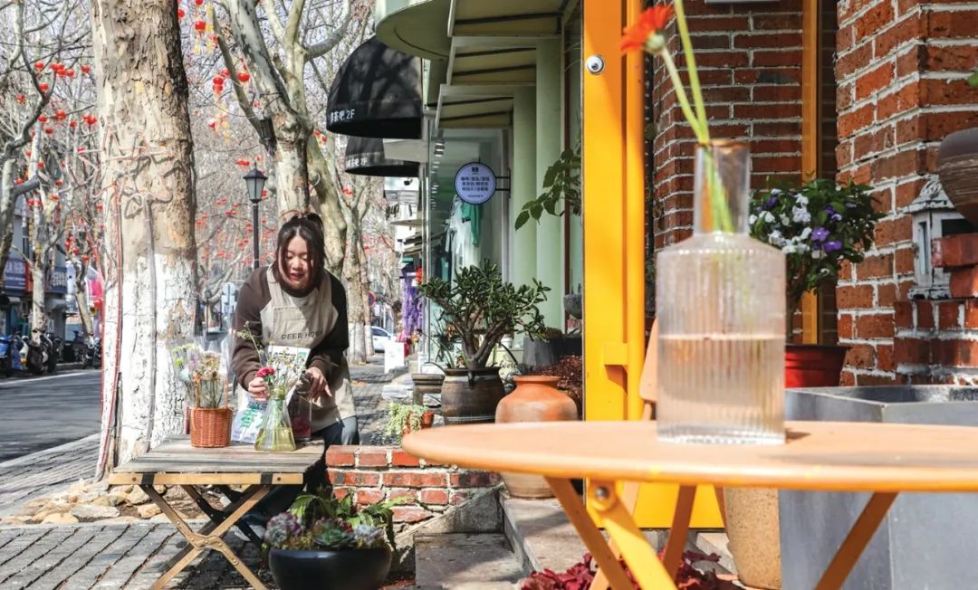 沿着两排文艺范十足的梧桐树往里走,街边各具特色的花店、甜品店、服饰店、餐饮店、网红文创店等店铺林立。随意选择一家走进去,都会带来许多惊喜。如今,这条南北长870米的老街,已聚集着11大类文化业态,有65家文化特色店铺,仅在抖音话题量就达500万次。