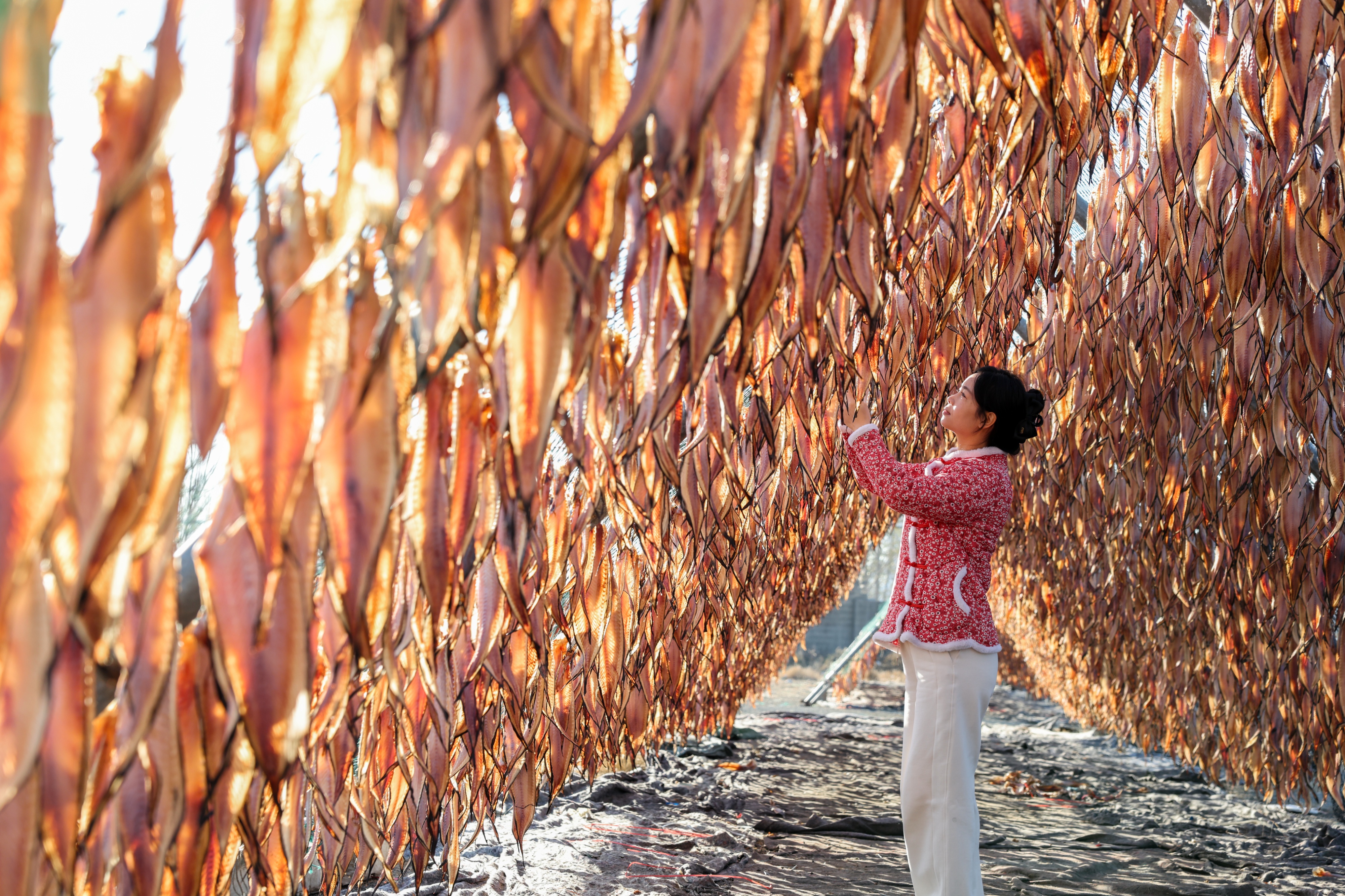 12月5日,在山东省荣成市石岛管理区的一个渔家院落,晾晒鱼干与直播带货同时进行。镜头前的“回水咸鱼干”传承当地千年制作技艺,如今借助直播飘香远方。李信君 摄